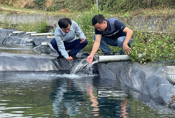 Cán bộ Trung tâm Khuyến nông kiểm tra nguồn nước ao nuôi,