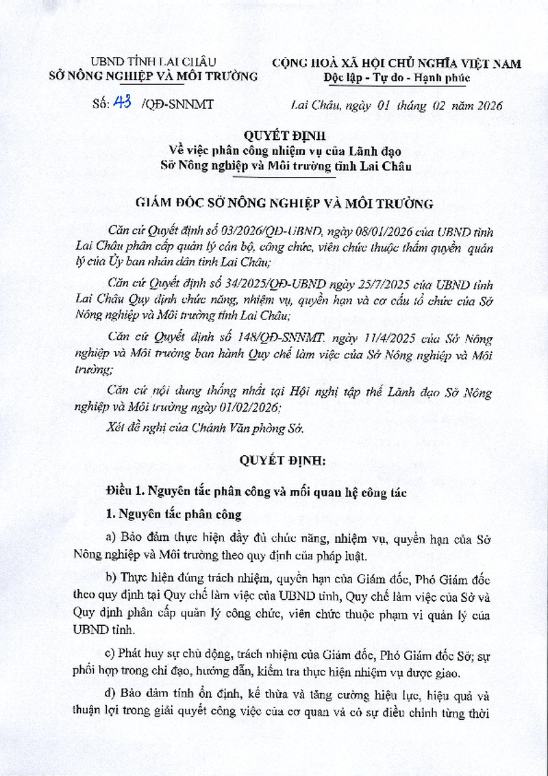 | Tiêu đề văn bản | Về việc phân công nhiệm vụ của Lãnh đạo Sở Nông nghiệp và Môi trường tỉnh Lai Châu | ||