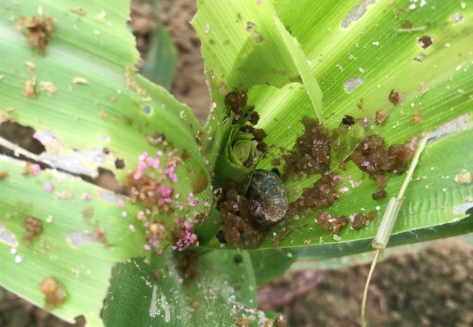 Đáng chú ý, sâu keo mùa thu là đối tượng dịch hại nguy hiểm, có khả năng sinh sản nhanh và phát tán mạnh. Sâu non thường gây hại trực tiếp trên lá và nõn, làm rách lá, ăn trụi phần non, thậm chí đục sâu vào thân, ảnh hưởng nghiêm trọng đến sinh trưởng cũng như tiềm năng năng suất của cây ngô. Trong điều kiện thời tiết nắng nóng xen kẽ mưa ẩm như hiện nay, nguy cơ sâu tiếp tục phát sinh và lây lan trên diện rộng là rất lớn nếu không được kiểm soát kịp thời.