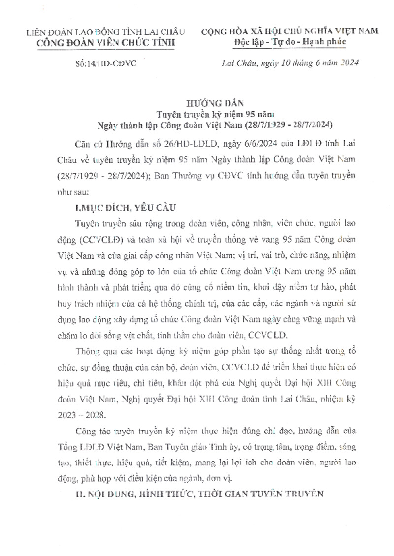 | Tiêu đề văn bản | Tuyên truyền kỷ niệm 95 năm ngày Thành lập công đoàn Việt Nam | ||