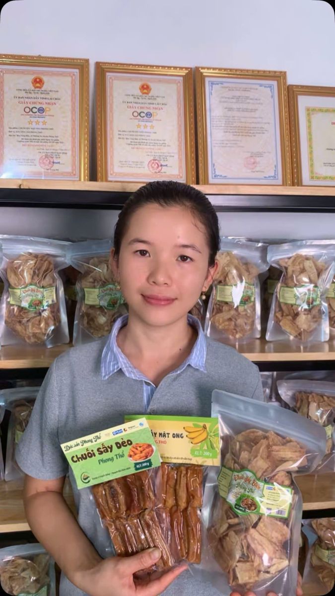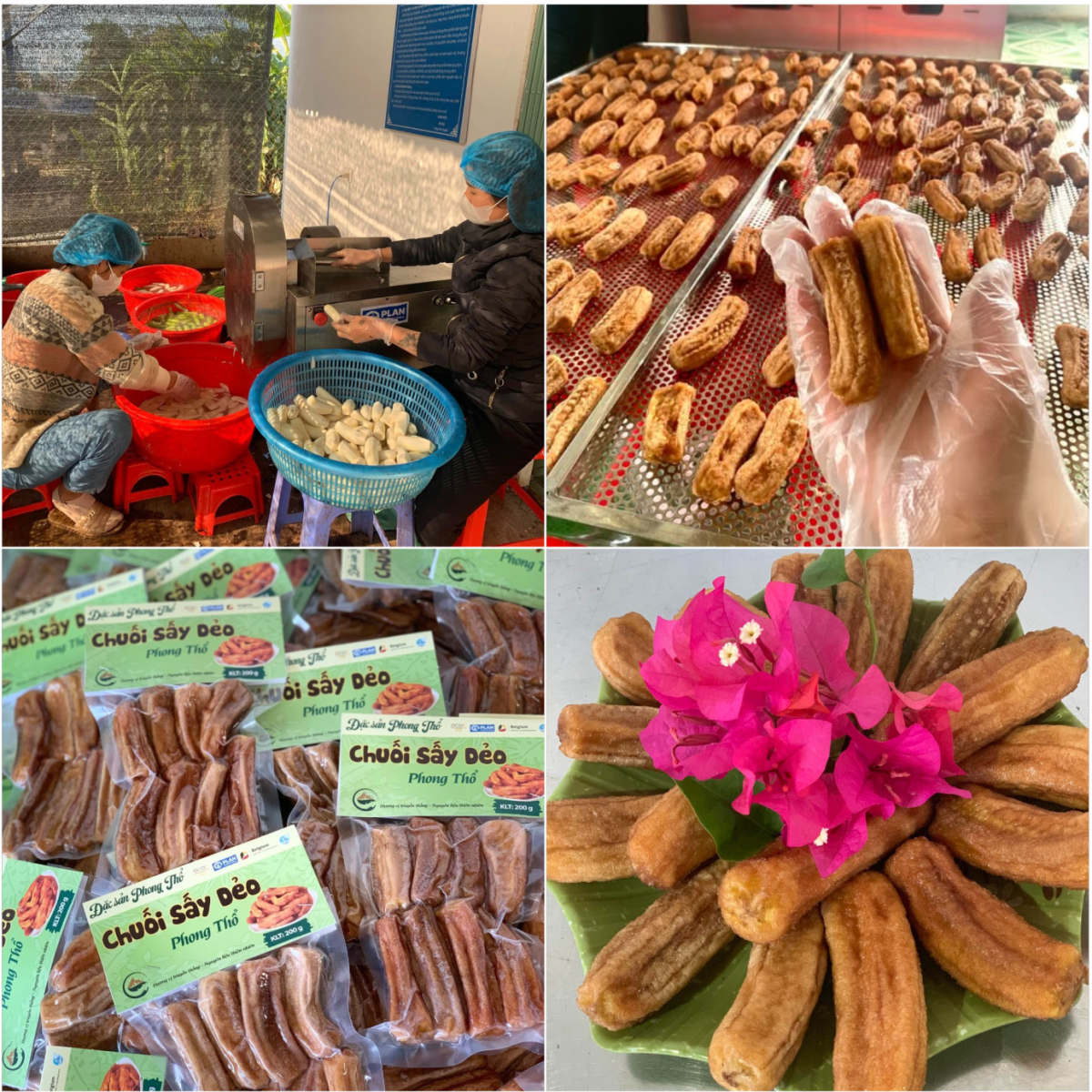 Nhóm thanh niên, trong đó có chị Vàng Thị Phạm - thành viên HTX Nông sản Phong Thổ, được tổ chức Plan International Việt Nam (Một tổ chức phi chính phủ quốc tế, phi tôn giáo, phi lợi nhuận hoạt động trong lĩnh vực bảo về quyền trẻ em, bình đẳng giới, phát triển cộng đồng, xóa đói giảm nghèo) hỗ trợ về máy móc sản xuất từ năm 2022, đã mạnh dạn khởi nghiệp với mô hình chế biến chuối sấy công nghiệp. Chị Phạm chia sẻ: “Chuối sấy giữ nguyên hương vị tự nhiên, có thời gian bảo quản lâu, được khách hàng tin tưởng đặt mua thường xuyên. Sản phẩm hiện được đóng gói đẹp mắt, có nhãn hiệu và truy xuất nguồn gốc rõ ràng. Giá trị chuối tăng gấp hàng chục lần, từ 3.000–5.000 đồng/kg tươi lên 120.000–150.000 đồng/kg sau chế biến, qua đó tạo thêm việc làm và nâng cao thu nhập cho tôi và các thành viên trong nhóm.”