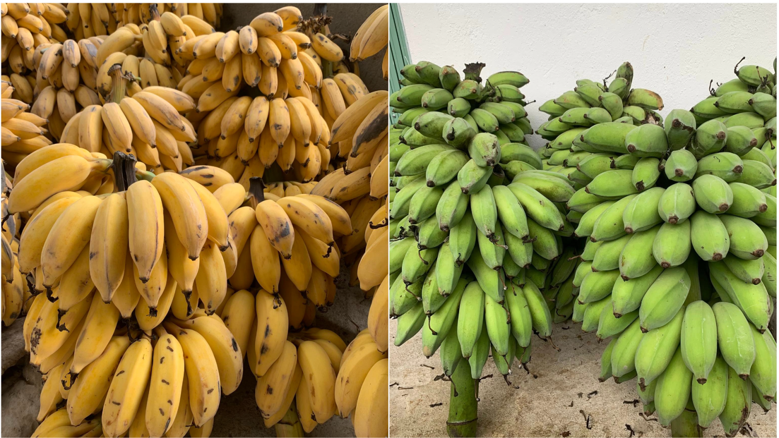 Chuối chín vàng (trái) và chuối xanh (phải) – sản phẩm nông sản được thu hoạch và bảo quản phục vụ chế biến.