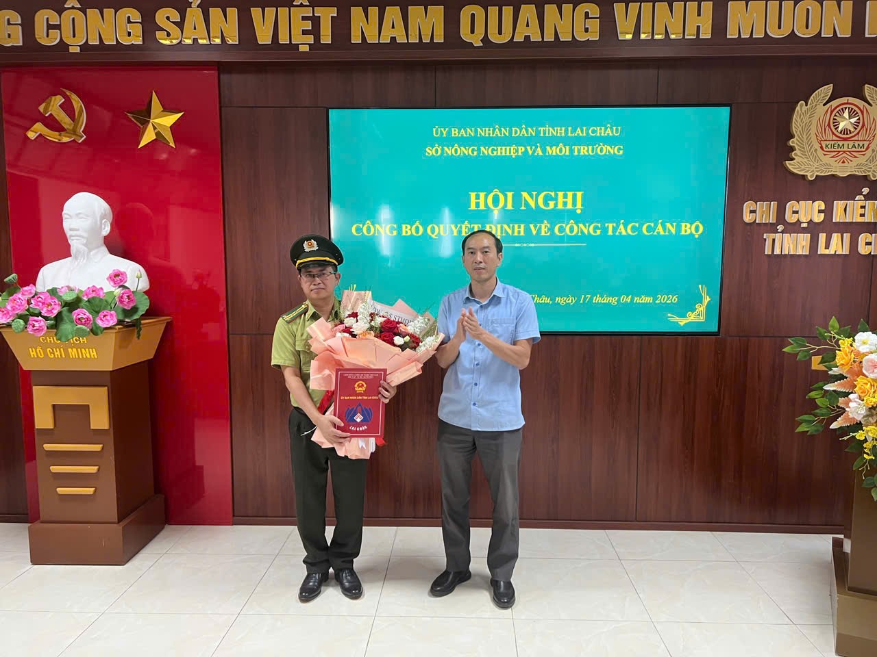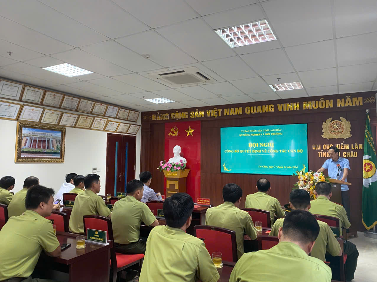 Chiều 17/04/2026, tại Hội trường Chi cục Kiểm lâm tỉnh Lai Châu, Sở Nông nghiệp và Môi trường tỉnh tổ chức Hội nghị công bố Quyết định của Chủ tịch Ủy ban nhân dân tỉnh về công tác cán bộ. Đồng chí Nguyễn Thành Đồng - Phó Giám đốc sở trao Quyết định và phát biểu giao nhiệm vụ.