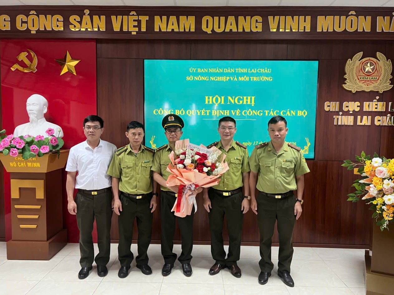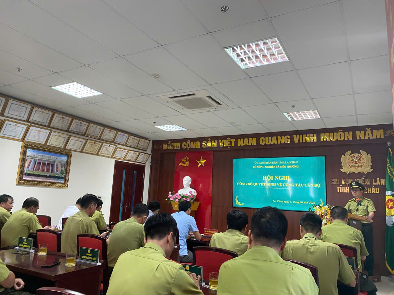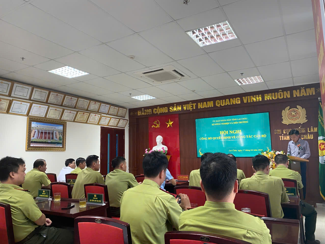 Tại hội nghị, đồng chí Bùi Tất Chung– Chánh Văn phòng sở đã công bố Quyết định số 678/QĐ-UBND ngày 07/4/2026 của UBND tỉnh về việc bổ nhiệm Chi cục trưởng Chi cục Kiểm lâm thuộc Sở Nông nghiệp và Môi trường. Theo đó, bổ nhiệm đồng chí Phạm Trung Tình giữ chức vụ nhiệm Chi cục trưởng Chi cục Kiểm lâm tỉnh Lai Châu. Thời hạn bổ nhiệm là 5 năm, kể từ ngày 10/4/2026.
